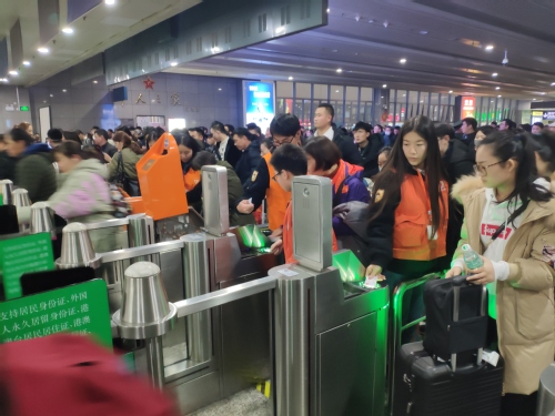 (“小甜橙”志愿者在检票口为旅客提供帮助)