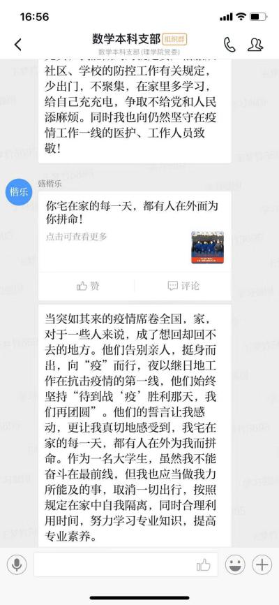 根据理学院党委“‘云’端学习不放松、组织生活不掉线”的工作要求,各学生支部通过线上“云端”组织生活的方式,借助学习强国平台,以交流讨论、视频会议等形式召开了一场主题为“同呼吸,共战‘疫’”的组织生活会。各学生支部组织党员认真学习领会党中央关于疫情防控指示精神和学校防控工作要求,纷纷表达了自己对疫情的感悟,以及身边的乡镇对于疫情防护的举措,认清自己在疫情防控工作中肩负的责任和使命。学生党员汪勇说,“这次疫情不仅仅是对我们哪个人或者哪个家庭的考验,而是需要我们举国上下全民参与。我相信,全国人民再坚持一段时间,我们很快能打赢这场疫情保卫战。”数学系研究生党支部书记卢文芸老师说,党员同志在疫情防控期间应响应国家号召,尽量避免外出,勤洗手,勤消毒,在力所能及的情况下帮助他人。
