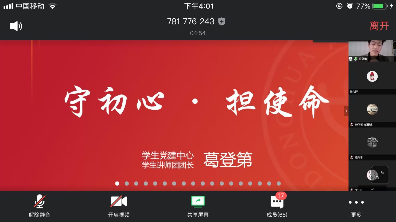为从青年角度看待疫情防控,从疫情中进一步明确入党动机与初心,学习榜样精神,勇担青年使命,4月7日,理学院第32期入党积极分子培训班开展了以“守初心·担使命”为主题的线上培训活动。此次培训由理学院学生党建中心学生讲师团团长葛登第主讲,学院入党积极分子在线聆听了党课。