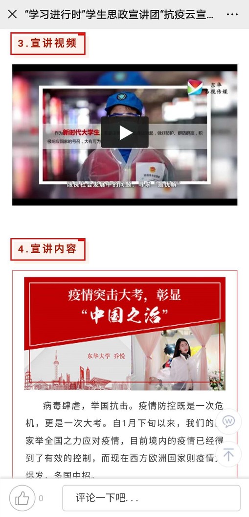 《疫情大考中的中国之治》《做理性思辨的网络守护者》等“云宣讲”系列线上微课一经上线,单日浏览量过千,累计视频点击率过万,“云宣讲”的学生讲师们通过图文并茂的演绎形式、喜闻乐见的网言网语迅速吸引众多学生听众成为宣讲团的铁杆“粉丝”,用朋辈的力量号召青年学生做网络安全的守护者和践行者。