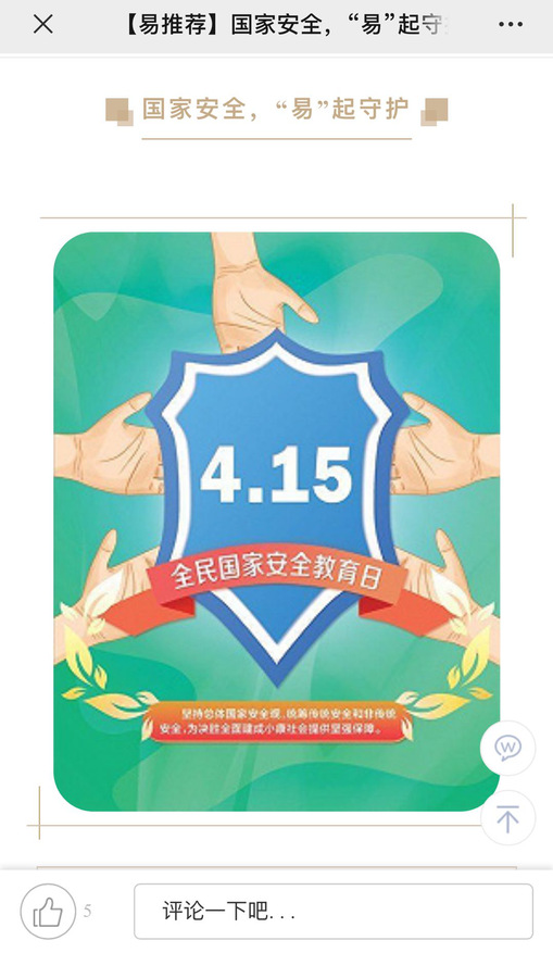 学校在践行立德树人根本任务过程中,将青年大学生培养成国家安全知识的积极传播者放在重要位置。充分利用易班优势网络平台开展网络安全“云教育”,面向全校师生推出《同上一堂国家安全教育课》,通过线上授课的形式,共同学习了教育部组织录制2020年全民国家安全教育日高校公开课,由公共安全领域专家、中国工程院院士范维澄讲授的《总体国家安全观视角下的疫情防控》,累计阅读量达3000余次。开展“我眼中的总体国家安全观”网络作品征集活动,鼓励全校师生利用专业所长创作漫画、诗歌、视频等网络文化作品,用形式多样的作品展现国家安全观的具体内涵、以诗情画意的方式表达学生捍卫国家安全的决心。同时,推出“国家安全,‘易’起守护”“中国看世界,世界看中国”等国家安全教育专题贴,以图文并茂的形式引导学生认识到国家安全、人人有责!
