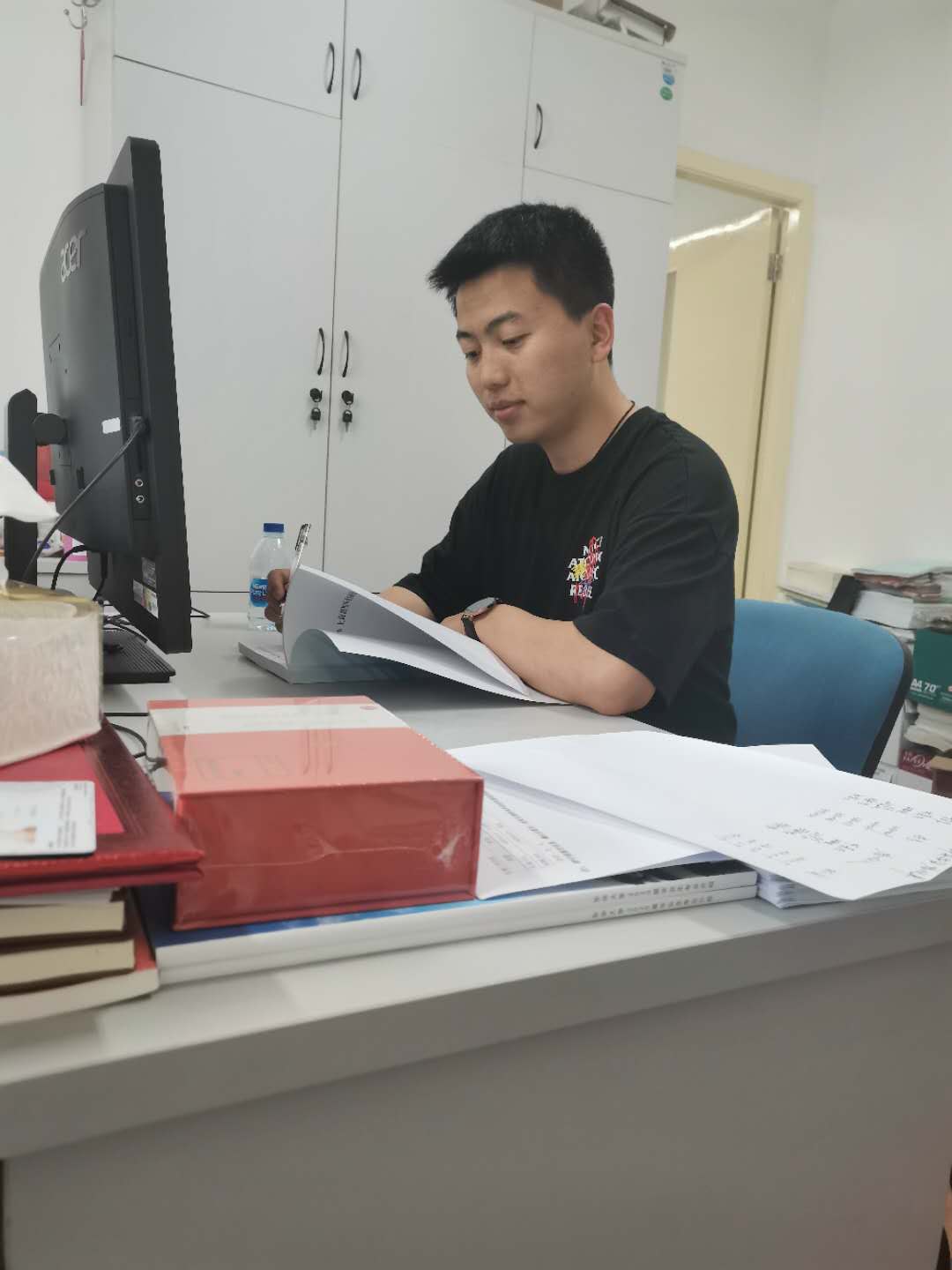 (杨东康认真阅读文献材料)