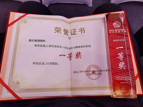 7月28日,首届上海市退役军人创业创新大赛颁奖典礼在浦东新区张江人工智能馆举办,国家大学科技园孵化的大学生退役军人创业项目“滇云蜜语”团队斩获一等奖!