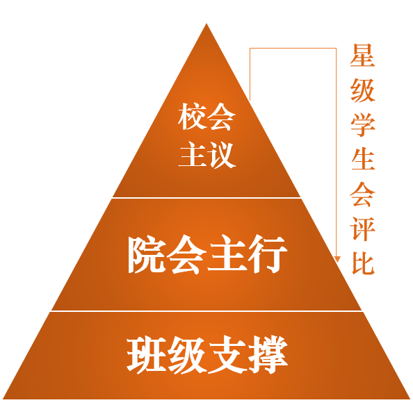 依托星级学生会评比对各学院学生会进行指导与考核,构建“校会主议、院会主行、班级支撑”的三级联动格局。