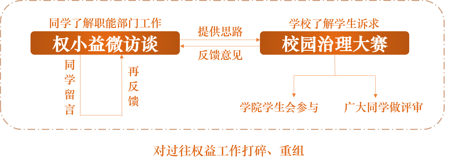 2019年,学生会打好一场“权小益微访谈”+校园治理大赛的“组合拳”,充分体现了学生会是学校联系广大同学的桥梁和纽带,广大同学通过学生会了解学校职能部处工作,学校领导老师通过学生会了解学生诉求,打破“单行道”、“二极管”式的联络模式。从小切口着眼重视参与并提升校园治理能力,进而围绕学校中心工作来进行提案工作。