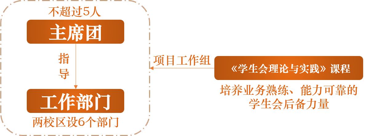 学生会大幅度进行工作部门及学生会工作成员数目的精简,形成“主席团+工作部门”的工作模式为骨骼。开设《学生会理论与实践》选修课,由学生会秘书长封华担任主讲人,以该课程为主要平台,系统培养业务熟练、能力可靠的学生会后备力量,学员自愿选择项目工作组进而转化为学生会的中坚骨干。