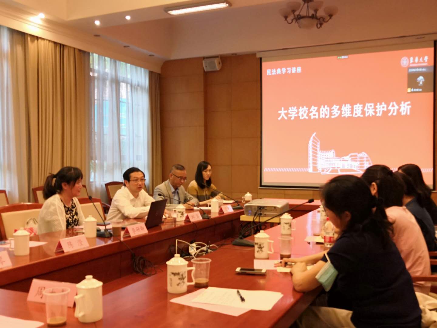 邱高在讲座中指出,民法典是新中国成立以来第一部以“法典”命名的法律,是新时代我国社会主义法治建设的重大成果,举行民法典学习讲座具有十分重要的意义。大家要深入学习宣传习近平总书记关于全面依法治国的重要论述,特别是关于民法典的重要指示精神,学习宣传民法典的基本原则和主要内容,让民法典走到师生身边、走进师生心里。当前,大学校名的保护亟待加强,要避免自己使用时发现已被他人抢注为“商标”,对其保护需要听取法官、律师等专业人士的建议。全校上下要牢固树立法治意识,深入学习民法典,对校名保护问题进行研讨,在今后工作中,尤其是对外工作,要重视保护学校的校名等无形资产。