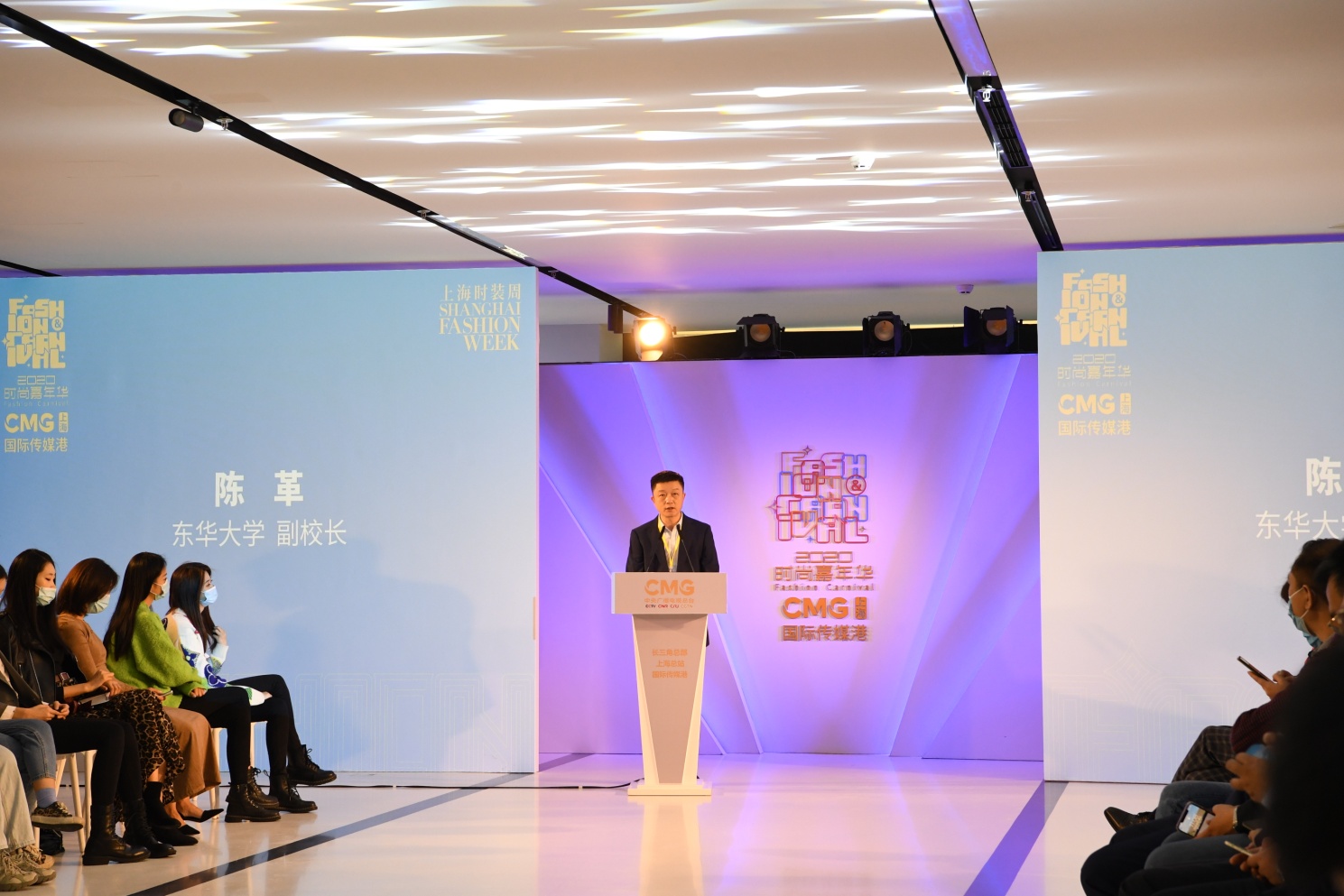 10月16日,由中央广播电视总台上海总站与我校合作展演的开幕大秀“新锐东华2020——大学生创意时装秀”拉开了2020国际传媒港首届“时尚嘉年华”活动的序幕。副校长陈革出席开幕式并致辞。出席活动的领导和嘉宾还有,中央广播电视总台上海总站、长三角总部、上海项目筹备组组长齐竹泉,东方国际集团党委书记、董事长童继生,北文时代(北京)文化有限公司董事长万子千等。