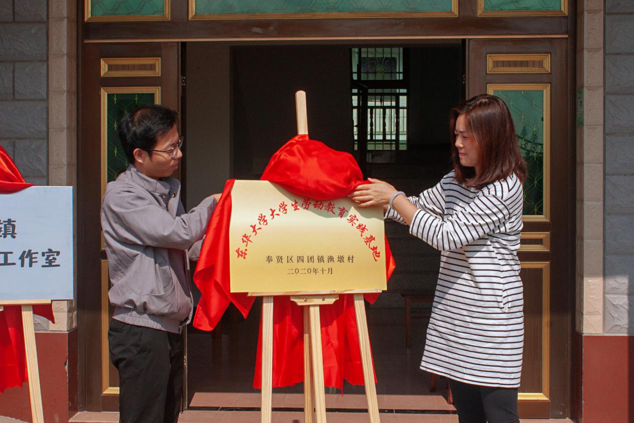 为进一步落实习近平总书记在全国教育大会的重要讲话精神,贯彻落实《中共中央 国务院关于全面加强新时代大中小学劳动教育的意见》精神,推进学校劳动教育纵深发展,10月18日上午,大学生劳动教育实践基地在奉贤四团镇正式挂牌,马克思主义学院学生劳动教育实践基地、机械学院党建育人共建基地、四团镇青年文创工作室同步揭牌。马克思主义学院党总支书记戴叶萍,校团委书记沈洁、四团镇党委副书记胡红兵、奉贤团区委副书记郑雷刚、奉贤区四团镇渔墩村书记方烨出席揭牌仪式,华英苑、机械学院、马克思主义学院等师生骨干参与本次实践活动。