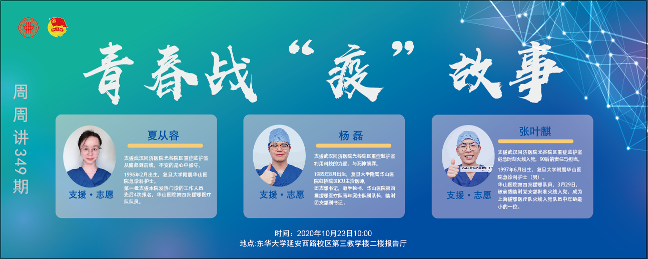 讲座简介:本期讲座邀请到三位复旦大学附属华山医院第四批援颚医疗队队员,他们或是掌握前沿医疗科技,与死神博弈;或是首批报名赴鄂,勇敢逆行;或是于最危急时刻火线入党,急赴前线。他们的抗疫故事是牺牲小我奉献大我的无畏选择,是把奋斗精神付诸于实践的现实写照。希望这场精彩的创新型思政课能为东华青年鼓舞精神、更加辨明前进的方向。