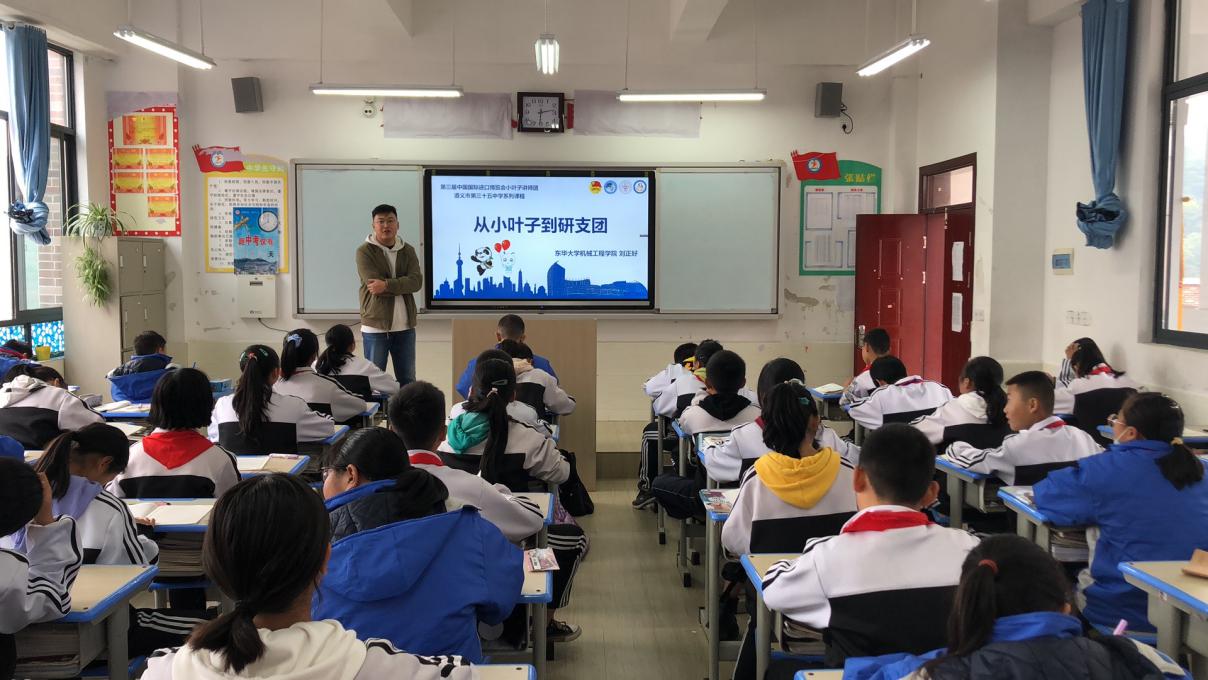 “志愿奉献你我 共享精彩进博”。依托志愿者培训,以线上线下相结合的形式,开展外语、国际化素养、四史等相关主题培训,将进博会作为团学骨干培养的“附加课”,让进博会成为志愿者综合素质提升的大课堂。充分发挥朋辈教育的力量,选拔5名往届优秀志愿者代表组成“小叶子”讲师团,从自身经历出发,讲述东华人的进博故事。其中首届研究生支教团成员刘正好和陈佳军,将进博故事引入课堂,让遵义市三十五中的孩子们了解进博、关注进博。今年,第二届研究生支教团的曹广浩也加入了志愿者队伍,在服务进博中传承着志愿精神。