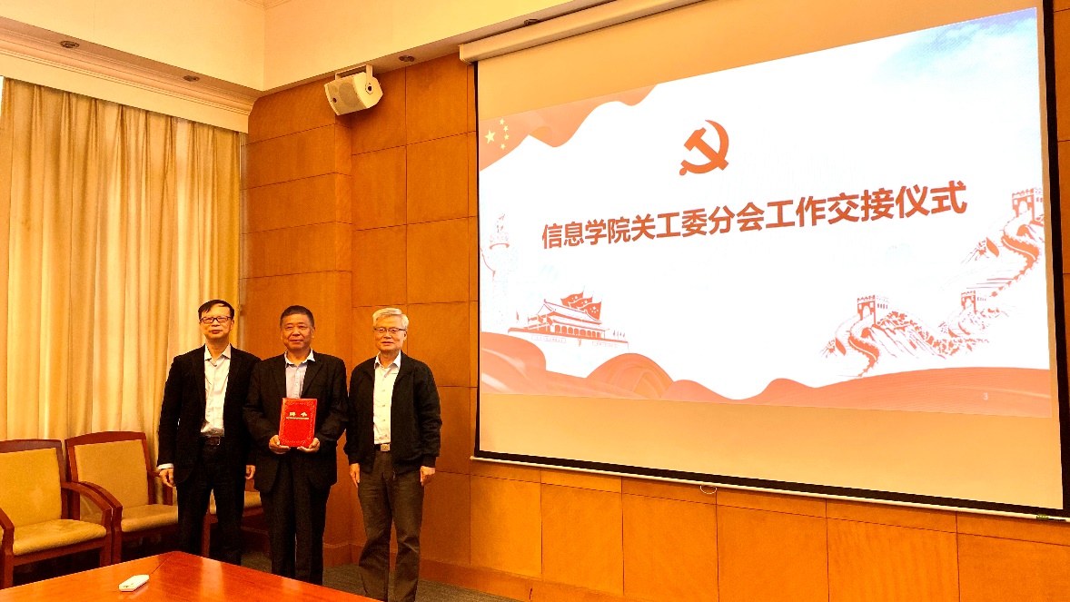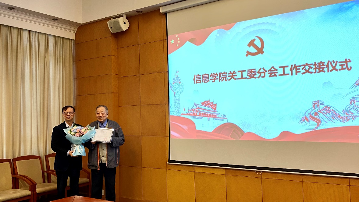 会上,还举行了关工委信息学院分会常务副主任工作交接仪式,王直杰代表学院党委向耿兆丰颁发荣誉证书表示感谢,浦解明代表校关工委为官洪运颁发聘书。