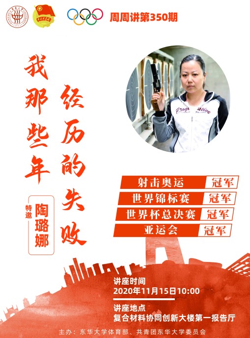主讲人介绍: 陶璐娜:射击奥运冠军,国际运动健将。1997年夺得运动生涯首个射击世界杯总决赛女子运动手枪项目冠军。整个运动生涯获得6次世界杯总决赛冠军。2000年获得第27届悉尼奥运会女子10米气手枪金牌,为中国代表团夺得首金。25米运动手枪获得银牌。多次当选国际射击联合会最佳女射手及全国十佳运动员。多次破世界纪录、亚洲纪录。2010年后历任上海市自行车击剑运动中心副主任、上海市,体育局青少年体育处副处长、上海市射击射箭运动中心副主任。荣获1997、1998、2000、2001、2002年国家体育运动荣誉奖章,2000年全国五一劳动奖章,2000年全国三八红旗手,2000年中国青年五四杰出贡献奖章,2000、2002年全国“十佳运动员”称号,2000年上海市劳动模范,2000年上海市三八红旗手标兵、“巾帼建功”标兵,2000年上海市新长征突击手标兵,2001年上海市人民政府记大功,2001年上海市十大杰出青年,2001—2002年度上海市三八红旗手,2000、2001年度“世界最佳女射手”等殊荣。第十四届、十五届上海市人大代表。