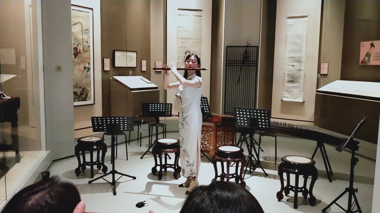 国风音乐会以一曲琵琶、古筝、二胡合奏的《春江花月夜》拉开序幕,曲境深远,乐音悠长,富有古典音韵优雅的格调。古筝独奏《渔舟唱晚》为观众呈现了一幅夕阳余晖,万顷碧波,渔船随波渐远的画面。此音此景,令人陶醉。江南丝竹是江南水土孕育而出的一种特有的表演形式,《云庆》把我们带入了晨雾依稀、楼台亭阁、小桥流水的水乡意境。笛子独奏《姑苏行》和琵琶合奏《阳春白雪》,将民乐乐器中的笛子和琵琶的声线展现得淋漓尽致,与艺术馆山水画展相得益彰。在一曲江南丝竹《欢乐歌》喜庆明快的气氛中画上了圆满的句号。