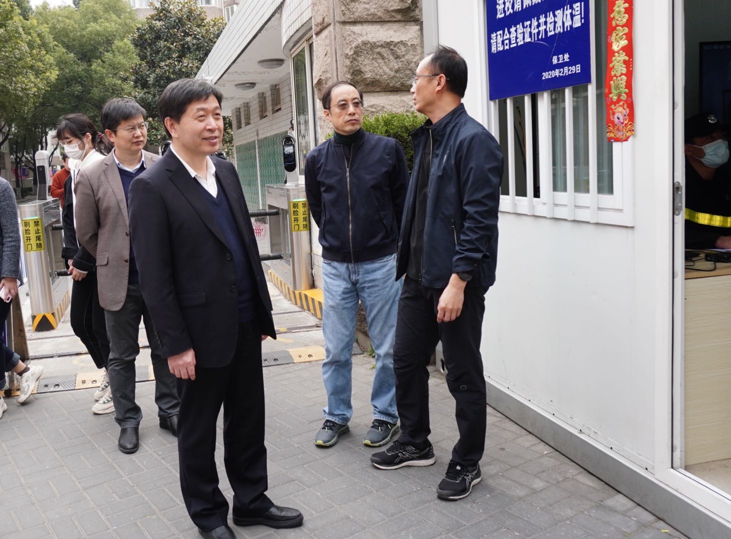 (校领导查看校门疫情防控情况)