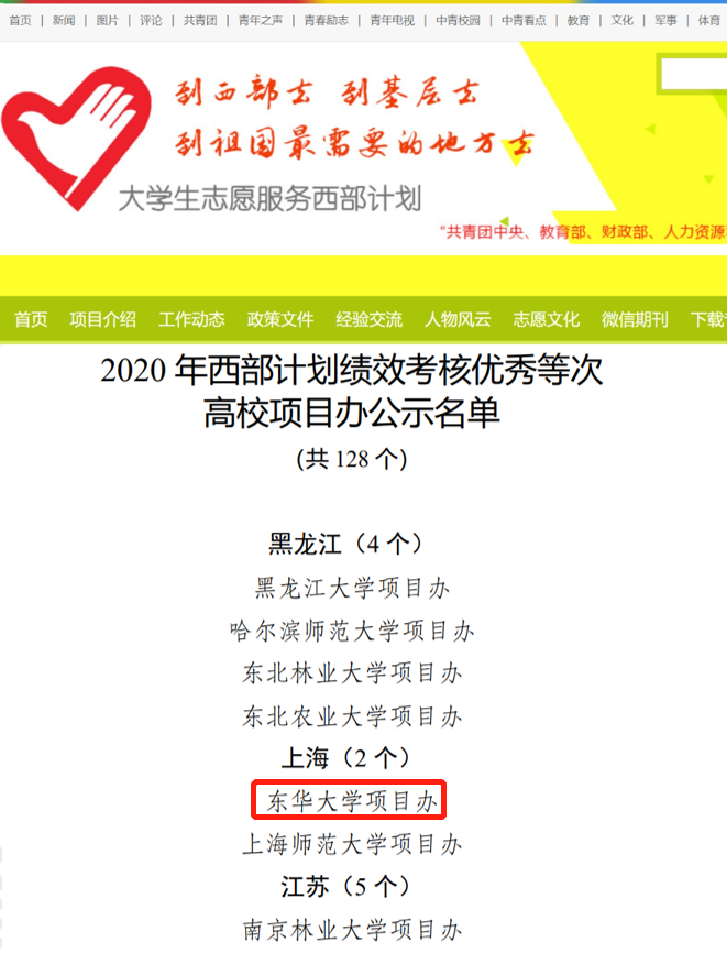 近日,全国大学生志愿服务西部计划项目管理办公室公布了2020年西部计划绩效考核优秀等次高校项目办名单,我校获评2020年西部计划绩效考核优秀等次高校项目办。上海市仅有两所高校获评该项荣誉。