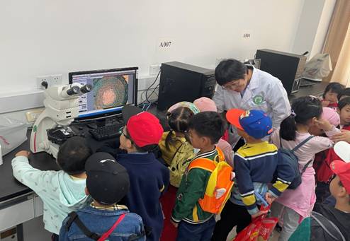 在党员的带领下,小朋友们通过参观了解了纤维材料发展历史,学习钱宝钧、方柏容等老一辈科学家为解决老百姓穿衣问题投身科学报国的精神品质,以及在新冠肺炎疫情期间积极开展口罩和防护服材料研发,为国计民生作贡献的执着追求。小朋友们还亲身体验了“显微镜里的动植物”和“神奇的变色溶液”趣味科学演示实验。在显微镜实验室,观察显微镜下的树叶、花朵植物标本以及孑孓、鱼鳃动物标本,真实感受自然界的微观世界,发挥想象力,启发创新灵感。在化学实验室,仔细听讲解、观演示,观察试管中液体变色,体验科学实验的神奇魅力。