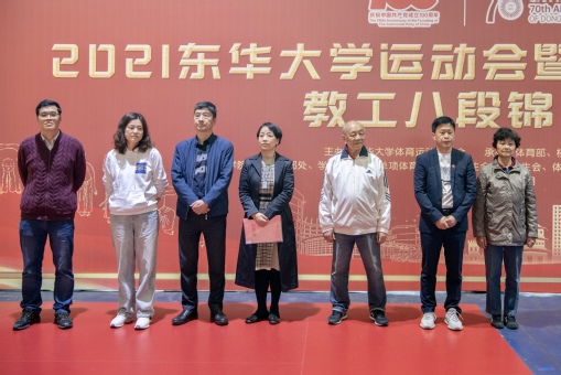 4月27日,2021年运动会暨第43届体育节教工八段锦比赛在我校松江校区体育馆举行。中国武术九段、知名武术家王培琨,校工会常务副主席陆湘群、体育部主任朱江华、团委书记沈洁、附属实验学校副校长瞿斌等相关部门负责人与教师代表共同参与。