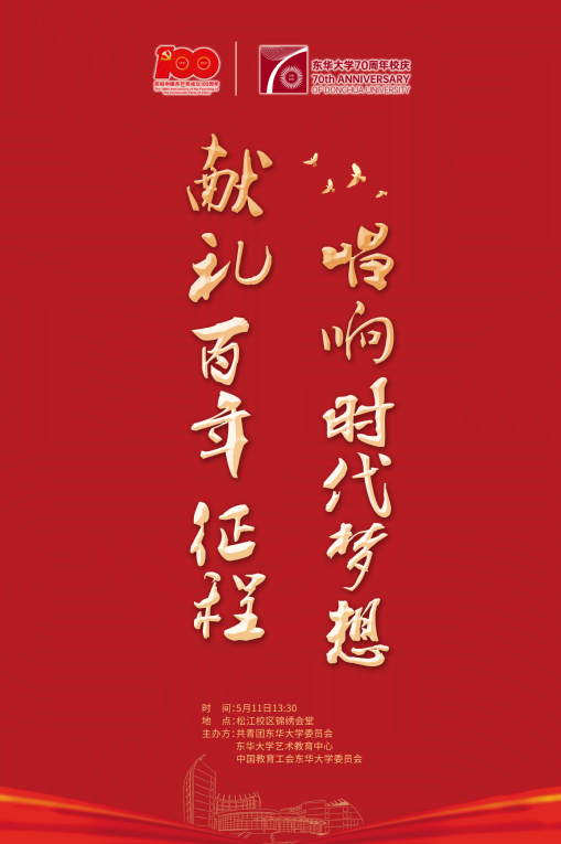 为庆祝中国共产党成立100周年和建校70周年,引领广大师生重温峥嵘岁月中党的奋斗历史、七十年光阴中东华的奋进故事,弘扬爱国主义精神,激发爱校荣校意识,营造为国家繁荣、为学校发展而拼搏的校园氛围,校团委、艺术教育中心、工会举办师生爱国歌曲比赛,以歌声祝福祖国和东华的美好明天。