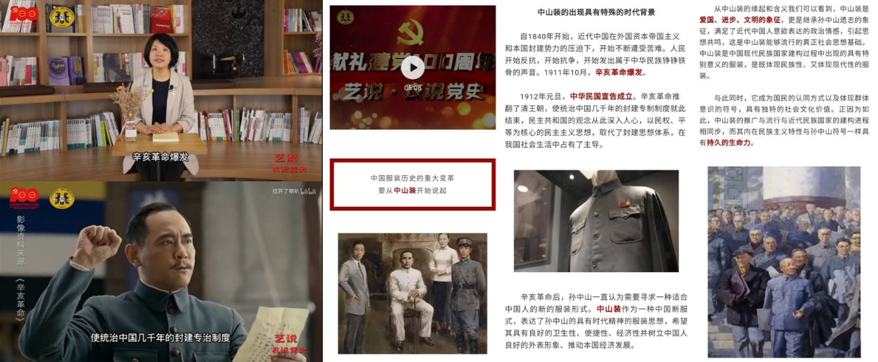 以专业教师、辅导员和学生为主讲人,围绕中山装、文明新装、人民装、军装与工作装、国际化时装、功能服饰设计、时尚与创意服饰,共计8类服饰,开设6堂党史微课,从服饰文化的一元到二元,穿梭革命与浪漫,感悟时尚与美好,不忘来时的坎,走好前行的路,书写民族复兴新篇章,唱好红色使命“大合唱”。
