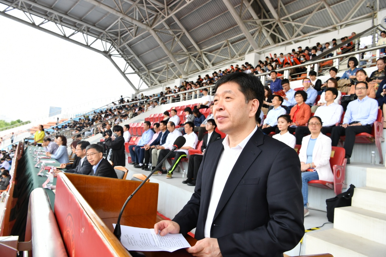 俞建勇致开幕辞,代表学校向运动会的召开表示祝贺,向精心筹备本届运动会的工作人员以及热情参与运动会的全体裁判员、运动员表示感谢。他指出,体育教育是全面贯彻党的教育方针的重要内容,是德智体美劳“五育并举”中不可或缺的组成部分。党和国家历来高度重视体育事业的发展,把建设体育强国作为全面建设社会主义现代化国家的一个重要目标。我校长期以来立足“五育并举”育人体系建设,认真践行“以体育人、以体育智、以体育心”的教育理念,广泛开展了包括个性化体育教学改革、特色化体育项目建设、高水平体育竞技人才培养等重点工作,并通过支持各类教职工体育协会、学生体育社团的建设,调动广大师生强身健体的积极性,培育积极向上、追求卓越的校园精神风貌。过去的2020年,面对突如其来的新冠疫情和疫情防控的常态化,学校创新线上教学方式,体育教学和体育锻炼未因疫情而中断。他表示,希望全体运动员发扬崇高的体育精神,赛出成绩,赛出风格,赛出水平;希望全体裁判员和工作人员恪尽职守,为师生运动员创造公平、公正的竞赛环境,优质高效地完成运动会各项比赛任务;希望全校师生在运动会这个平台上相互学习,加强交流,增进友谊,培养和塑造健康的身心、完善的人格和坚强的意志力。