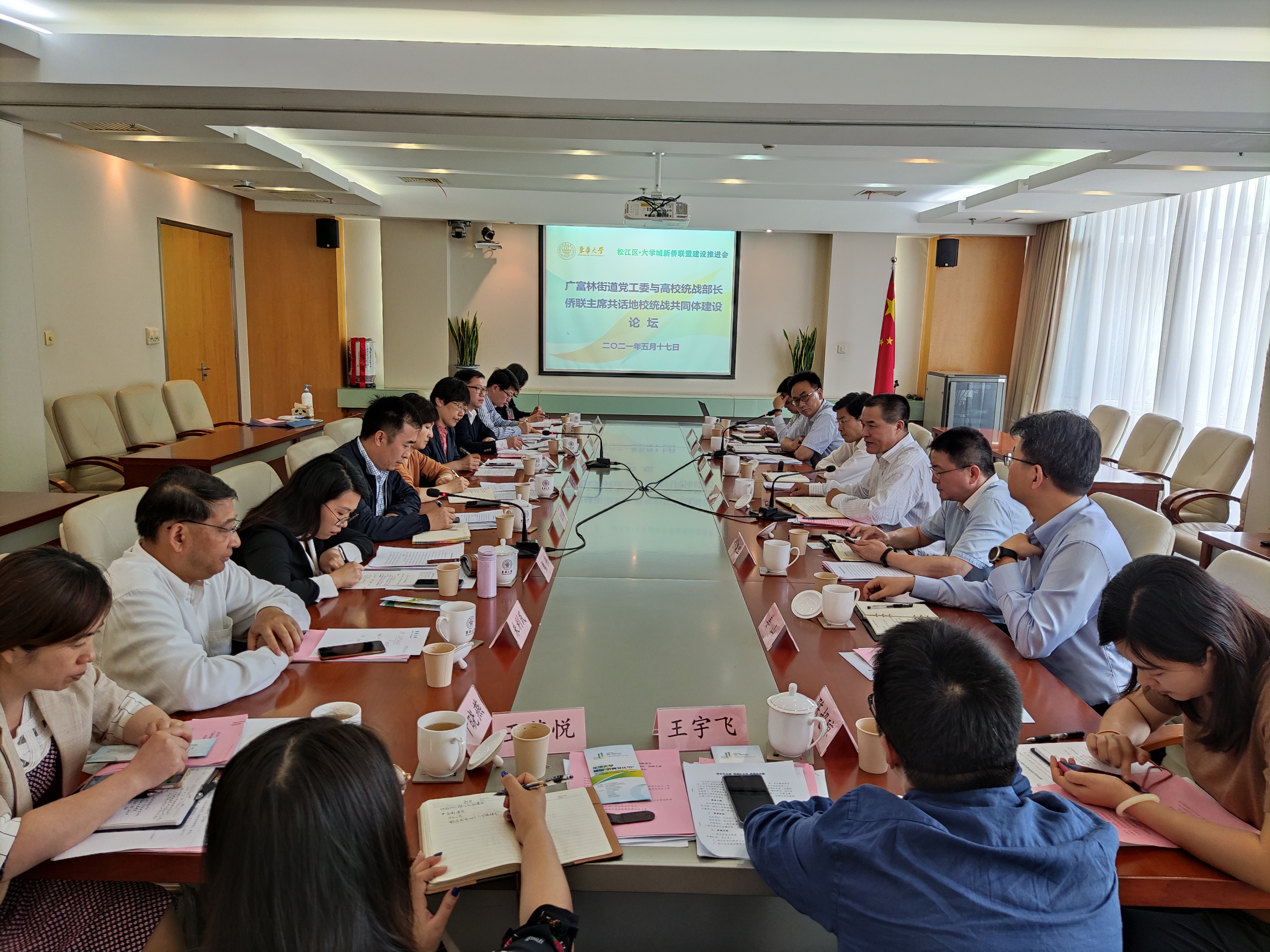 为进一步发挥统战优势,深化地校合作,5月17日下午,首届“侨青文化节”系列活动之松江区·大学城新侨联盟建设推进会——广富林街道党工委与大学城高校统战部长、侨联主席共话地校统战共同体建设论坛在我校松江校区举行。松江区委常委、统战部部长吴继华出席并讲话,区委统战部副部长陆佩华,区委统战部副部长、区侨联党组书记、主席、区侨办主任陆洪明,广富林街道党工委书记、人大工委主任姜山,校党委常委、党委统战部部长朱英,上海外国语大学党委统战部部长刘蓉蓉,以及大学城各高校统战部副部长、侨联主席,广富林街道党工委委员、人大工委副主任马文辉共同参加。活动由广富林街道党工委副书记胡伟强主持。