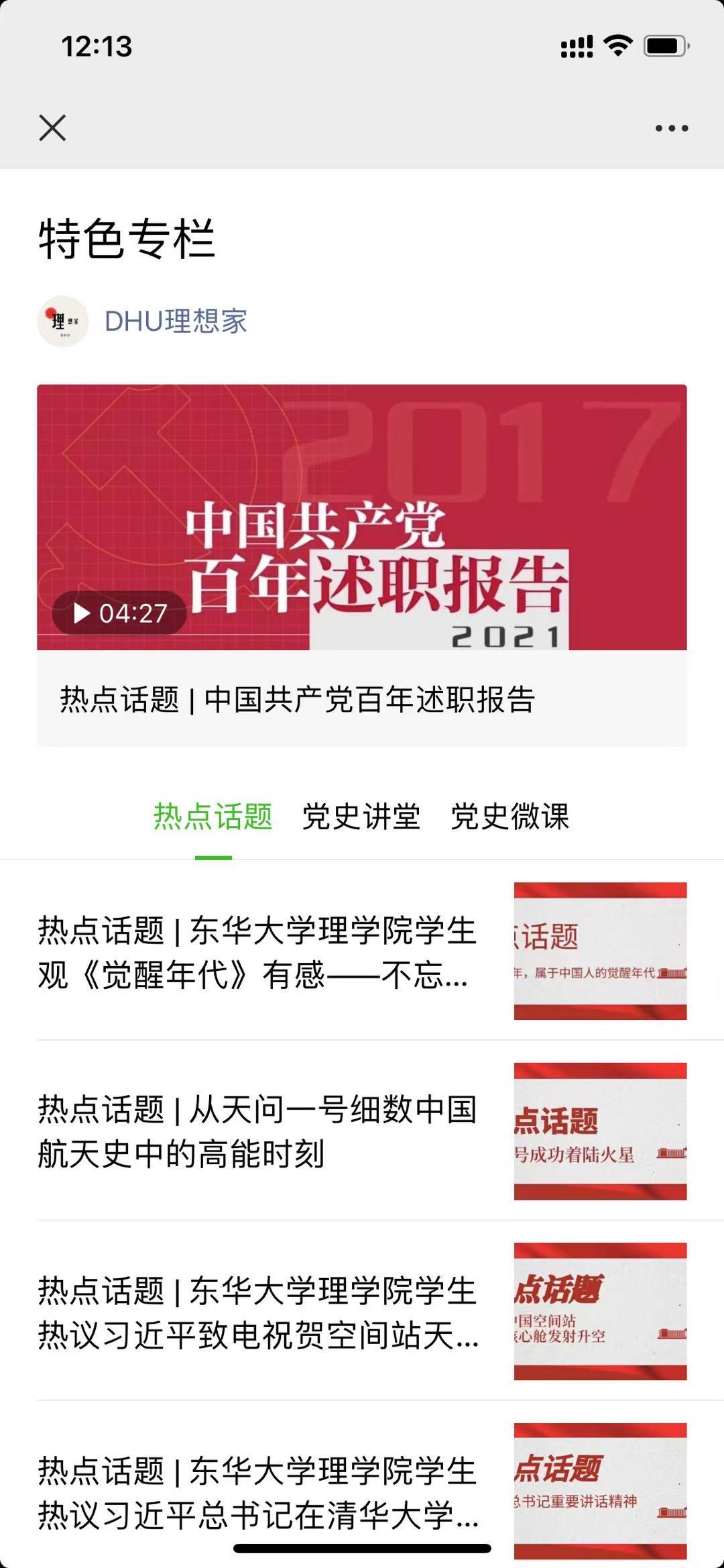 线上学史,口袋课堂。积极开辟线上教育阵地,发挥网络育人优势,将党史学习阵地从“线下教室”搬到“线上讲堂”,依托“DHU理想家公众号”开办“党史讲堂”和“党史热点话题”,以时间脉络和重大节点事件为主线,目前已推出“党史讲堂”21讲和“热点话题”5次,内容丰富、生动鲜活,集图文、影音为一体,将党史学习装进口袋,将社会热点与党史学习教育结合,随时随地学,不断扩大学习教育覆盖面,凝聚全院师生听党话、跟党走的奋进合力。