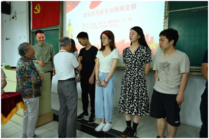 (老党员为新党员佩戴党徽)