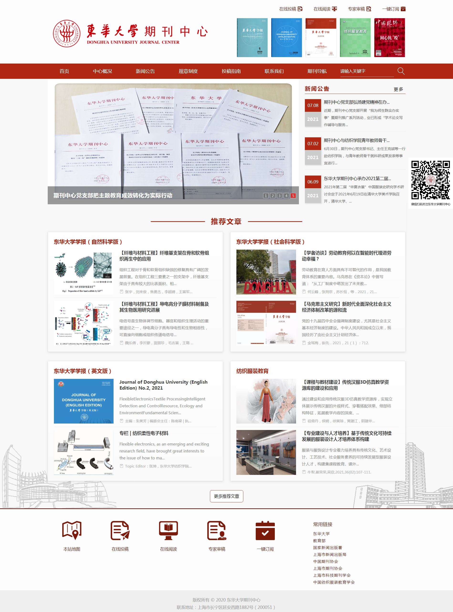 期刊中心积极推动各刊向“专、精、特、新”方向发展,着力建设生物医用纺织材料、纺织结构复合材料、先进纺织智能制造、深度学习与纺织、马克思主义研究、中华服饰文化、课程思政等重点特色栏目。同时结合党的百年史以及学校70年校史,汇聚相关专家、学者、教师专题研究成果。