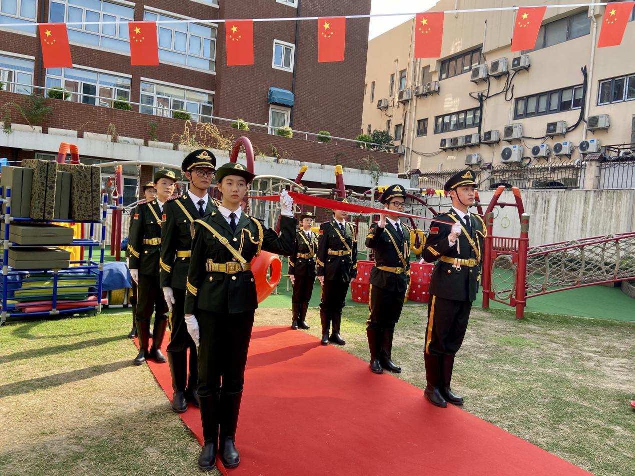 9月28日上午,在国庆前夕,服装与艺术设计学院国旗护卫队党支部师生走进静安区常熟幼儿园开展“我为群众办实事”爱国主义教育活动。