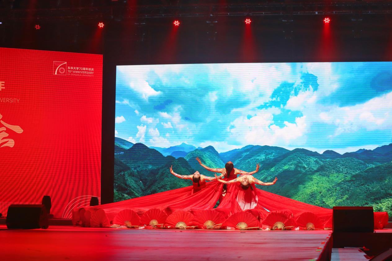 10月16日晚,建校70周年文艺晚会在松江校区体育馆举行。晚会由《衣尚东华》和《唱响东华》两个部分组成,500余名师生同台演出,展现了东华的历史积淀与青春活力。其中,《衣尚东华》由服装与艺术设计学院师生团队原创设计并演出;《唱响东华》由校团委牵头、人文学院传播系团队策划创作,在校生、校友代表、教工合唱团、退休教工合唱团、东华附校合唱团、各大艺术类社团、舞蹈团等联合演出。