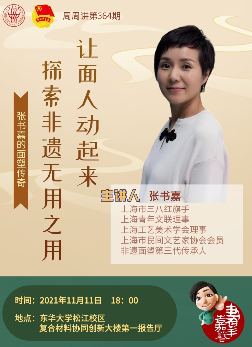 讲座讲述张书嘉的面塑传奇,以及非遗创业路。传统手工注入更有想象力的跨界合作再创造,探索出一条非遗时尚传播之路。从一个十几平的小工作室开始,慢慢进入了社区、学校、商圈。结合自己长达近30年的面塑制作经验,她打破了传统师傅带徒弟的教学方式,更多以“非遗+”概念将传统手工和现代需求相结合,非遗面塑+创意故事、表达力、艺术心理等。并不断尝试作品的跨界合作,如非遗面塑饰品、非遗面塑动画、非遗面塑MV。对面塑未来的发展,她希望大家不要把传统艺术当做只能在橱窗里远观的事物,而是对动手能力和思维方式的一种宝贵的补充。通过讲座,让学生了解张书嘉“非遗”这条创业路。