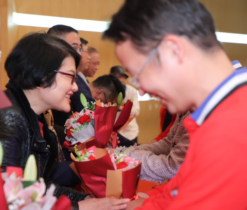 在“薪火相承”仪式中,伴随着东华校歌的旋律,荣休教师为新教职工庄重地佩戴象征东华教师身份的校徽,传递使命感与荣誉感。新教职工为荣休教师献上鲜花,表达敬意与感谢。