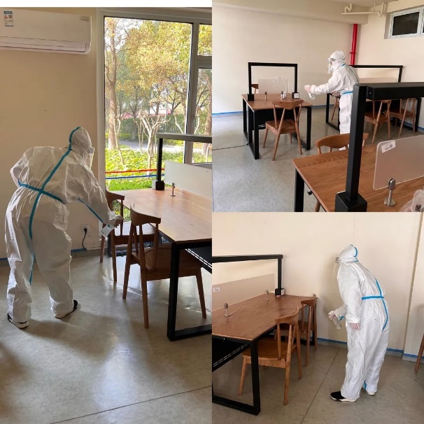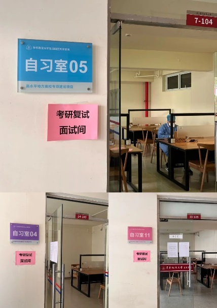收到18名同学的复试需求申请后,华东政法大学协调了五期宿舍园区7、14、18号楼共三间共享自习室作为考研复试面试间。3月23日一早,学生就业中心及宿管办老师一行六人携电脑设备,共赴园区实地查看场地、布置面试会场、调试网络和设备,并安排保洁宿管工作人员现场消杀,确保场地符合防疫安全卫生标准。