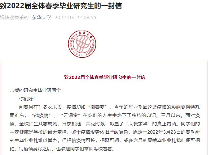 不过略有遗憾的是,最有仪式感的毕业典礼不得不延期。在《致2022届全体春季毕业研究生的一封信》中表示,“同学们的平安健康是学校的最大牵挂,鉴于疫情形势依旧严峻复杂,原定于2022年3月23日的春季研究生毕业典礼难以举办。但相信疫情可控,相聚可期,或许六月的夏季毕业典礼我们便可相约。待疫情消除之后,也欢迎同学们常回母校看看。”