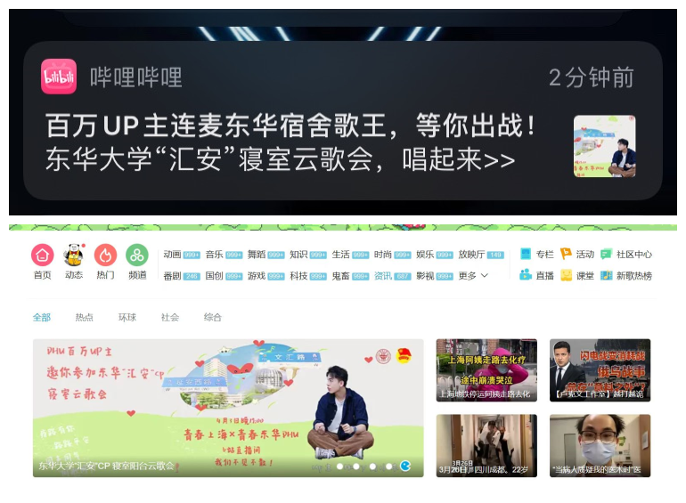 百万校园B站up主当主持、室友齐报名献唱、寝室传来吉他弹唱……4月3日晚,被温暖的声音包围,长达90分钟的寝室云歌会两校区隔空连线对唱,为疫情期间“宅”校的大学生鼓气打劲。活动通过B站“青春上海”与“青春东华”联合直播间播出,6.5万人次师生同时在线观看。