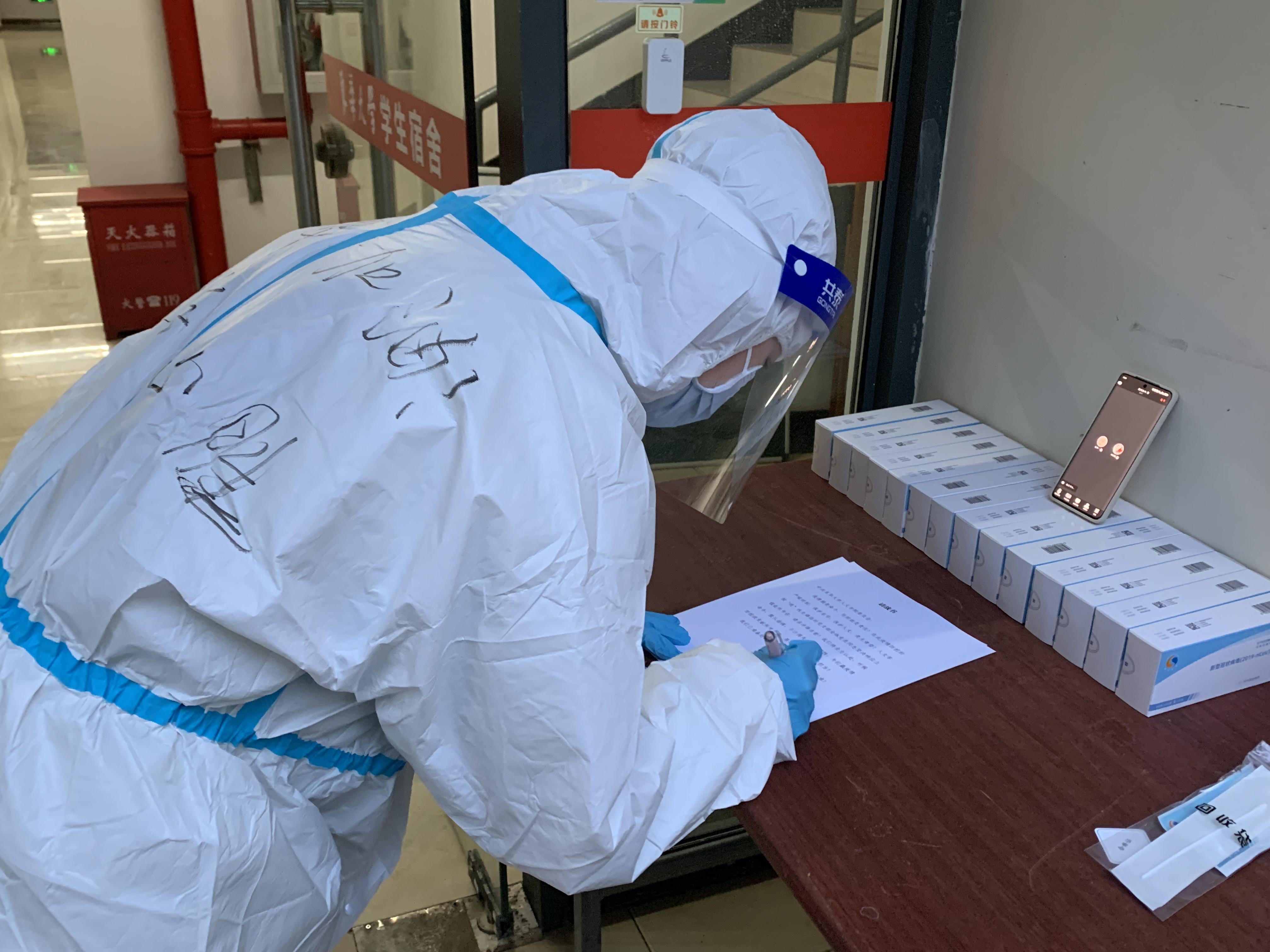 “请大家保持安全距离!”十二宿驻楼辅导员李华清正紧张地忙碌着。此时,负责核酸采样的医护人员到达宿舍门口。由于楼栋人数众多,时间紧、任务重,李华清迅速组织层长、寝室长,稳中有序开展核酸检测。三个小时后,凌晨一点,950余人全部完成核酸采样。凌晨两点,在兼职辅导员和志愿者同学的协助下,完成所有学生的采样核对,并进行数据报送。