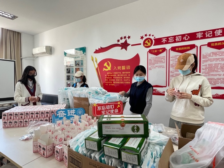 (志愿者为学生分发物资-抗疫盲盒)