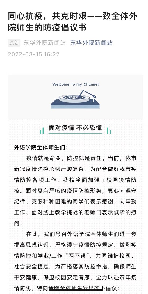 “我院向全体师生发出如下倡议……做联防联控的践行者,做防疫措施的示范者,做校园防疫的守护者,做抗疫精神的传播者……”3月15日,学院党委通过学院微信公众号发布《同心抗疫,共克时艰——致全体外院师生的防疫倡议书》,号召广大党员主动亮身份、亮行动、亮作为,在抗击疫情和保障教学两个阵地上积极作为,身体力行、模范践行疫情防控要求。本轮疫情发生以来,学院党政领导带头进校值守,靠前指挥,坚守岗位;各支部耐心细致做好师生思想政治工作,带领师生党员亮身份、见行动;学院党员教师全员到社区报到,在学校和社区核酸检测、物资发放等抗疫一线工作中争当志愿者,践行党员初心使命。