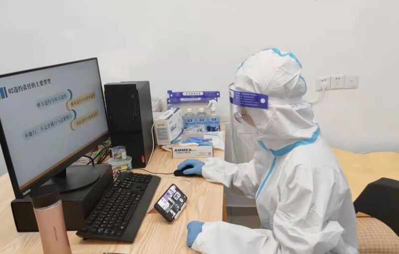 上观新闻:不脱大白服讲授网课,宿舍门房外在线教学,