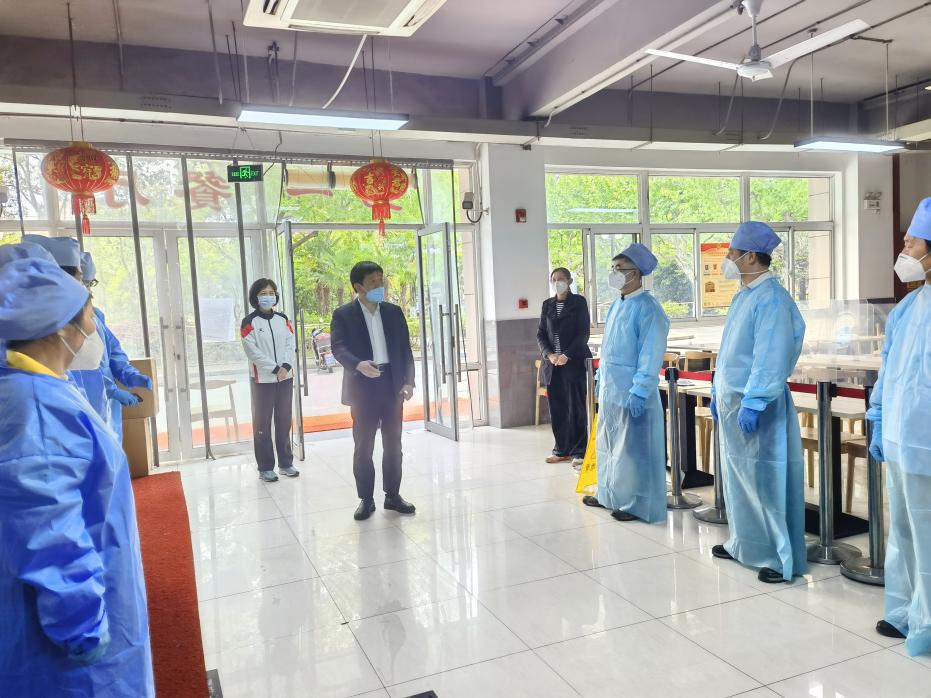 俞建勇还来到校门口、食堂、校医院、后勤服务中心、隔离点等场所,向坚守岗位工作人员的辛勤付出和努力表示敬意和感谢。他指出,疫情防控以来,各项工作时间紧、任务重,大家在各自岗位上恪尽职守、不辞辛劳、日夜奋战,为守护校园安全和师生健康提供了坚实有力保障,为打赢校园疫情防控攻坚战作出了重要贡献。他叮嘱大家一定要注重加强个人防护、注意劳逸结合,并鼓励大家继续发扬伟大的抗疫精神,再接再厉、戳力同心,以坚定的信心和决心,坚决打赢疫情防控这场大仗硬仗。
