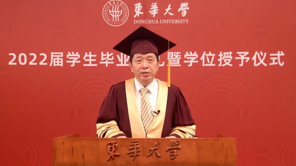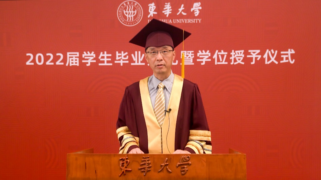 亲爱的同学们,六月的上海,栀子花开,毕业的骊歌再次响起。我们告别在鲜花怒放的盛夏,也许今天这场云上典礼因没有现场拨穗而显得不够完美,但它承载的祝福与期盼依旧。此去经年,希望大家记住这个春天的温暖与感动,带着东华给予你的涵养、学识、修为和品格,牢记国家赋予我们青年一代的使命和责任,勇敢去拼,放心追梦!