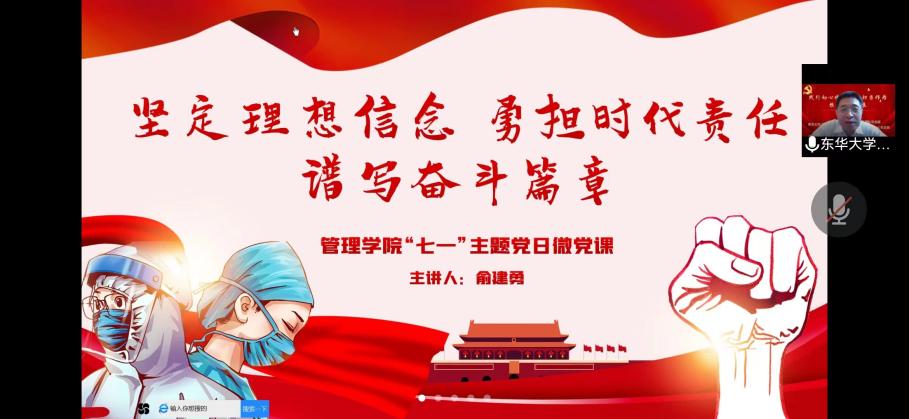 近日,校长俞建勇参加管理学院会计学领航团队党支部、大数据与算法研究中心党支部“践行初心使命 强化担当作为 推进内涵发展”主题党日活动,以“疫情防控显担当、凝心聚力谋发展”为主要内容与管理学院师生党员开展学习交流,并上了题为《坚定理想信念 勇担时代责任 谱写奋斗篇章》的党课。
