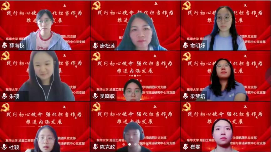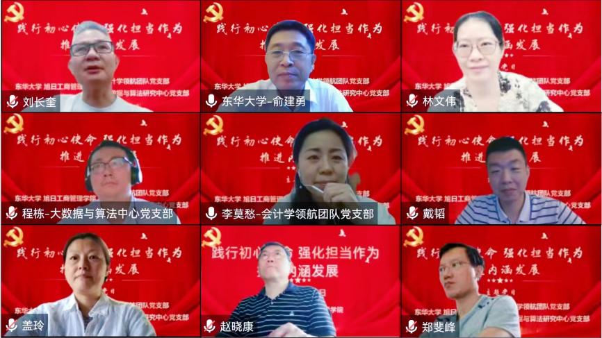 会计学领航团队党支部书记李莫愁以“疫情防控显担当”为主题,回顾党支部教师心系学生,发挥专长,冲锋一线的战疫故事。不忘育人初心,坚守本职工作,确保教学工作顺利展开;全体党员教师积极响应学院党委“薪火树人”师生共建项目“抗疫路线”,对接帮扶转运至校外的学生,主动联系关怀,缓解同学们的心理焦虑,并提供专业上的支持;第一时间响应号召,100%下沉社区基层党组织、积极投身抗疫一线。大数据与算法研究中心党支部书记程栋老师以“聚力谋发展,喜迎二十大”为主题,进行交流分享。通过溯飞天历程,学航天精神,总结党支部党建带学术成果。并回顾支部前期相关工作,全体党员凝心聚力确保二十大顺利召开,后期将持续组织开展系列学习、做好宣讲、践行榜样力量,以更加奋进的姿态、扎实的作为,迎接党的二十大。