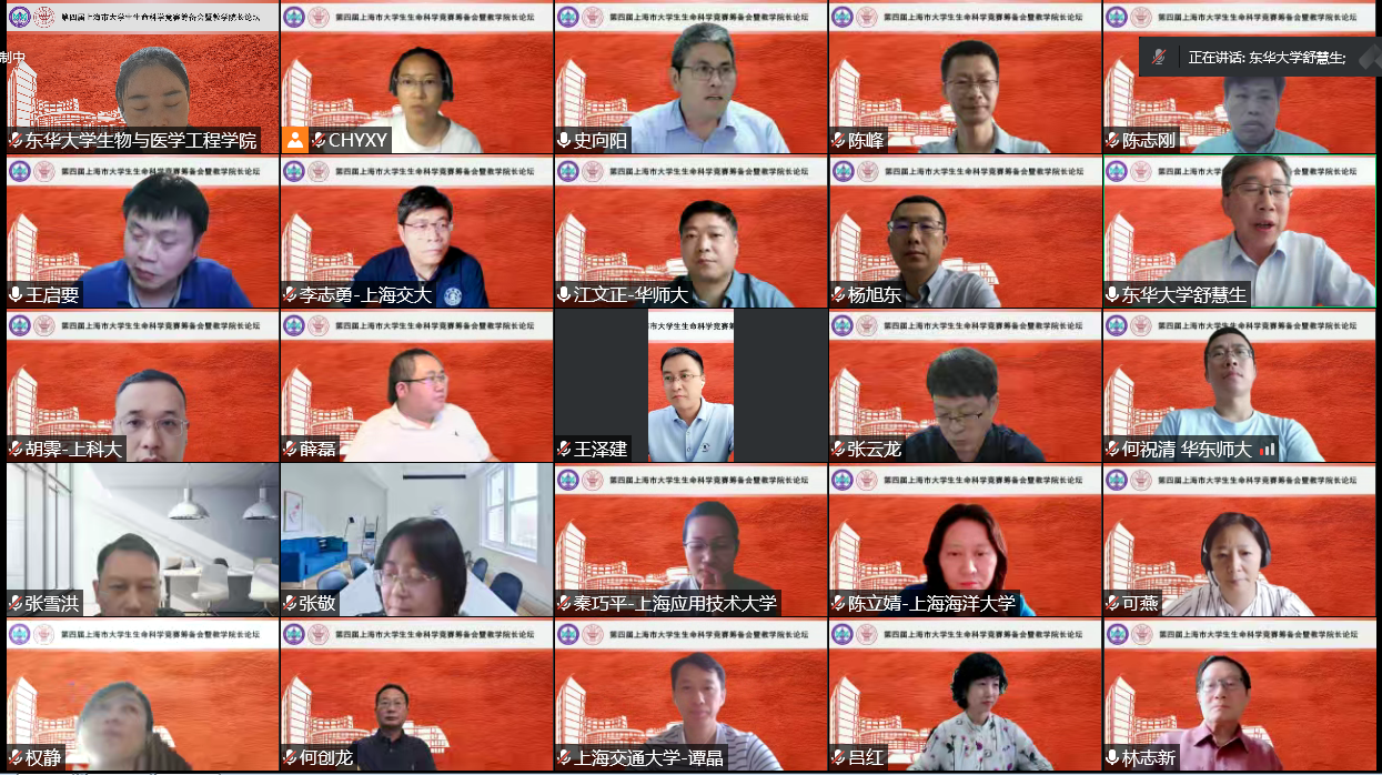 7月15日下午,由生物与医学工程学院承办的第四届上海市大学生生命科学竞赛筹备会暨教学院长论坛在线上举行。副校长舒慧生、全国大学生生命科学竞赛委员会副主任委员陈峰、全国大学生生命科学竞赛委员会(创新创业类赛道)秘书长张雪洪、全国大学生生命科学竞赛监督委员会(科学探究类赛道)主任委员林志新、上海市大学生生命科学竞赛监督委员会主任委员杨继、教务处处长杨旭东,以及来自上海市13所生物类相关高校的教学副院长、领队及校级管理员参加了本次论坛。论坛由生物与医学工程学院副院长史向阳主持。
