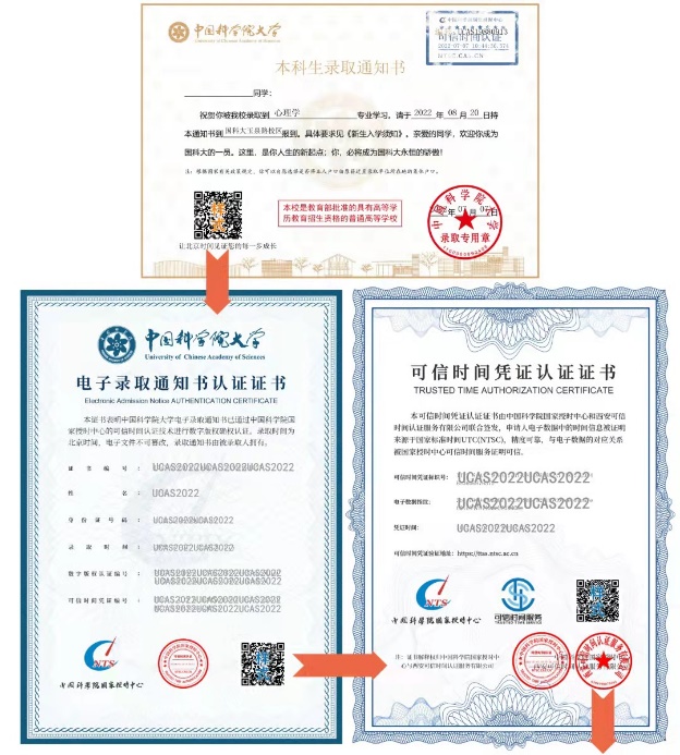 中国科学院大学今年寄出的“至简”本科生录取通知书满满高科技,通知书上有为每一位新生定制的独一无二的“时间戳”,采用高精度时间同步技术和密码学技术,新生扫码就能以电子形式记录“启信”的毫秒级精确时刻,时间由中国科学院国家授时中心根据“北京时间”校准发布。