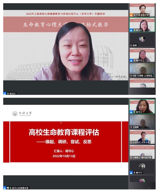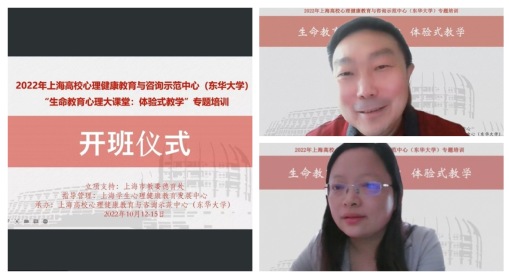 10月12日-15日,由上海高校心理健康教育与咨询示范中心()承办的2022年度“生命教育心理大课堂:体验式教学”专题培训在线上顺利举行。10月12日,我校心理健康教育与咨询中心主任曹宁宁主持开班式,来自上海交通大学、华东师范大学、华东理工大学、上海师范大学等40所高校的72名心理教师和心理辅导员齐聚云端,开启4天的系统学习。培训围绕心理健康和生命教育互动体验课堂的教学理念、设计思路、示范讲解等内容展开,学员分组进行实操性学习、实践与演练。