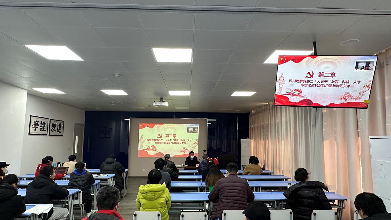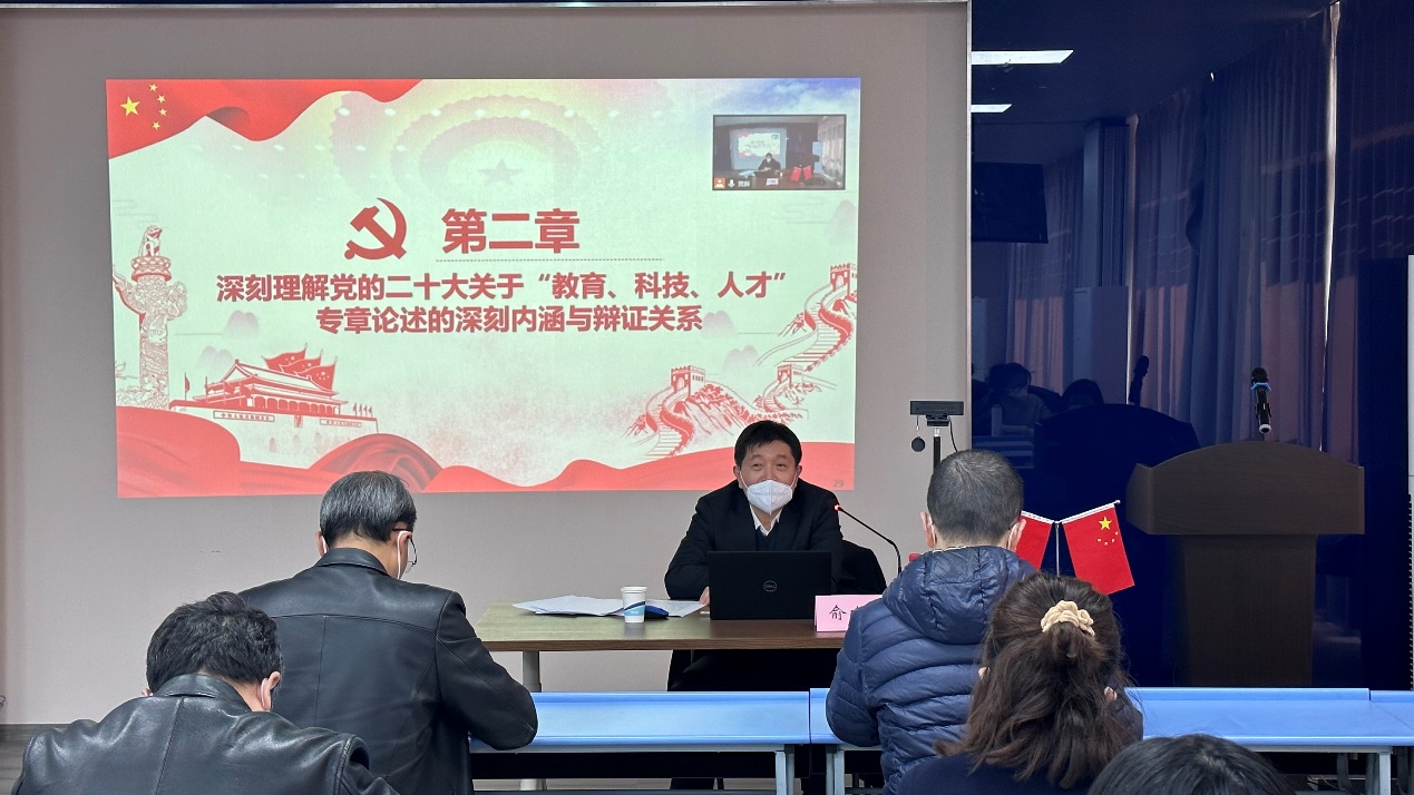 俞建勇从学习领会党的二十大深刻内涵和重大意义、深刻理解党的二十大关于教育科技人才专章论述的深刻内涵与辩证关系以及结合学校实际全面贯彻落实党的二十大精神等三个方面对党的二十大提出的重要论述和战略部署进行了全面系统又重点突出的辅导解读。他指出,党的二十大“事关党和国家事业继往开来,事关中国特色社会主义前途命运,事关中华民族伟大复兴”,全面准确学习领会党的二十大精神,必须深刻领悟党的二十大关于党和国家事业发展的历史逻辑、理论逻辑和实践逻辑,要深刻领会党的二十大的鲜明主题、深刻领会过去五年和新时代十年伟大变革的重要意义、深刻领会新时代中国特色社会主义思想的世界观和方法论、深刻领会以中国式现代化推进中华民族伟大复兴的使命任务、深刻领会以伟大自我革命引领伟大社会革命的重要要求。