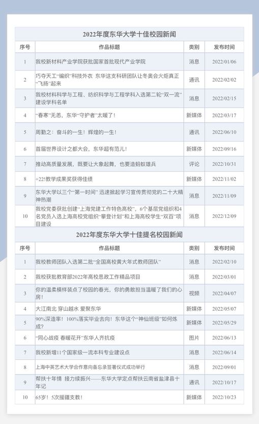 2022年校园好新闻评选已经落下帷幕,重温2022,回顾那些独属东华人的高光时刻,切换那些温暖人心的画面,触摸这一年带给我们的那些感动……新的一年,第一缕曙光已经洒在波光粼粼的镜月湖上,东华校园涌动着的勃勃力量将继续书写着不息的奋进故事,奋斗2023。