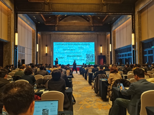 在研讨环节,相关企业代表及学者专家围绕“废塑料物理再生的高值化途径”和“化学再生与低碳材料”进行了深入交流研讨。巴斯夫塑料添加剂业务部亚太区技术经理葛玲介绍了再生塑料在其多次加工过程中容易产生黄变、力学性能缺失等变化,选择正确的塑料添加剂能够避免相应的性能损失,同时对于下游应用开发也能起到重要的作用。莱斯特瑞兹亚洲区域工艺部门副主管、高级工艺工程师Lukas Vogel与莱斯特瑞兹机械(太仓)有限公司销售经理袁林共同介绍了莱斯特瑞兹用于高附加值回收的双螺杆挤出机以及莱斯特瑞兹的循环经济相关案例。华润化学材料科技股份有限公司研发总监、产业项目负责人康念军向大家讲解了华润化学开发基于消费后PET的化学回收方法。江苏集萃托普索清洁能源研发有限公司总经理赵铁均分析了废塑料制备裂解油是目前化学回收的重要途经,介绍了托普索开发的催化剂和工艺路线在行业中的广泛使用情况。